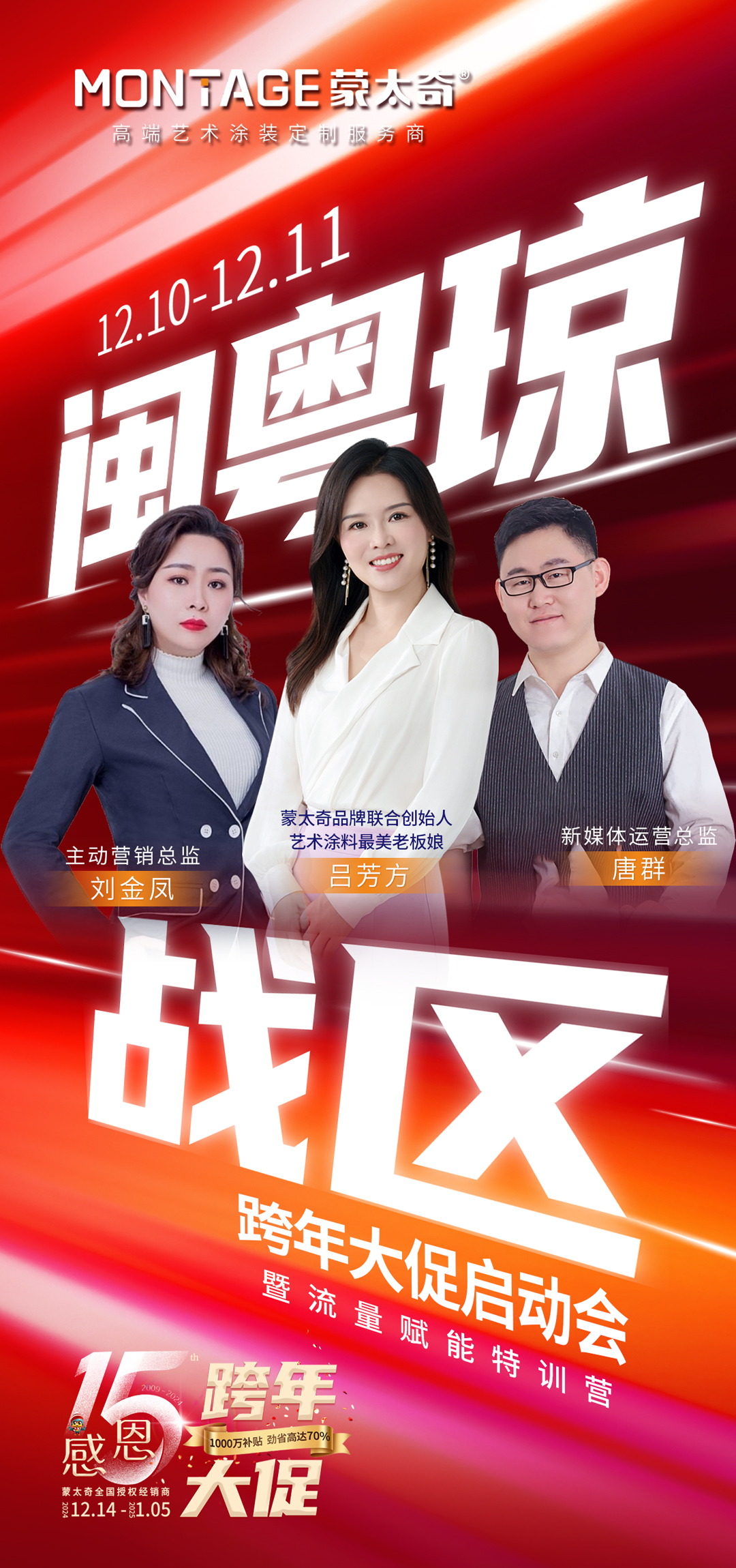 12月10日—11日,為期兩天的蒙太奇“粵閩瓊戰區跨年大促啟動會暨流量賦能特訓營”順利結營。此次培訓不僅屬于福建、廣東、海南三地的聯動特訓,更通過直播形式覆蓋到了全國經銷商。特訓營旨在幫助終端門店提升新媒體實戰能力,通過專業課程培訓,熟練運用新媒體營銷工具,拓寬門店獲客渠道,為跨年大促做好沖刺準備。
