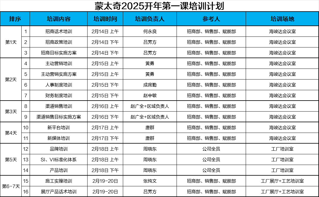 在接下來的六天的培訓中,蒙太奇將展開一系列針對性強、實用性高的專業(yè)技能培訓課程,涵蓋招商策略、主動營銷、渠道銷售、新媒體運營、品牌SI/VI標準化體系、產(chǎn)品培訓等多個領(lǐng)域。這些培訓不僅有助于員工個人能力的提升,也將促進團隊協(xié)作效率的全面提高。通過這次全面的培訓,蒙太奇期待打造一支更具戰(zhàn)斗力的專業(yè)團隊,以更昂揚的姿態(tài)邁向新一年的征程,向著更高更遠的目標奮力沖刺。