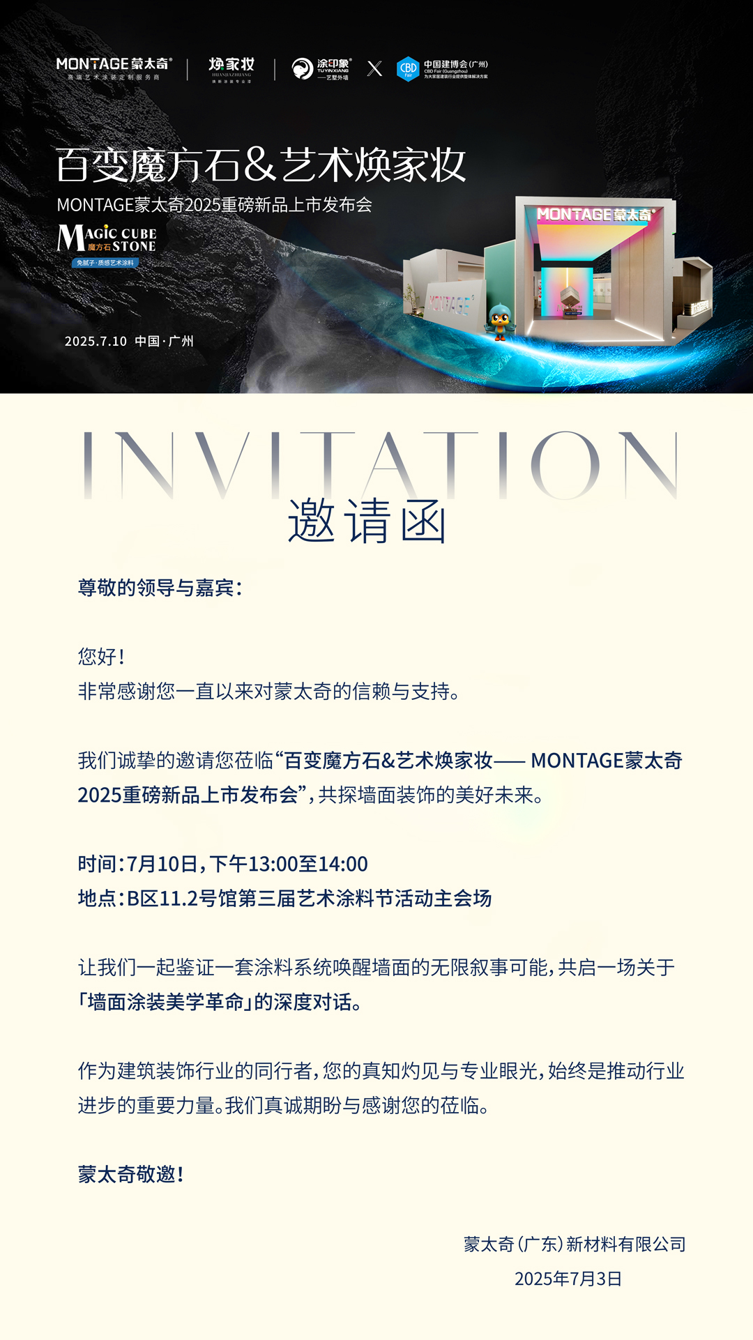 接下來的三天,蒙太奇展館將有更多精彩看點(diǎn)等待解鎖。值得關(guān)注的是,7月9日13:00至14:00,蒙太奇將在廣州建博會(huì)B區(qū)11.2號(hào)館第三屆藝術(shù)涂料節(jié)活動(dòng)會(huì)場(chǎng),舉辦以“百變魔方石·藝術(shù)煥家妝”為主題的蒙太奇2025重磅新品上市發(fā)布會(huì)”。將有行業(yè)專家、設(shè)計(jì)師以及蒙太奇的核心團(tuán)隊(duì)共同參與,開啟一場(chǎng)關(guān)于墻面涂裝美學(xué)革命的深度對(duì)話,一同探索墻面裝飾的美好未來。我們誠摯邀請(qǐng)您蒞臨現(xiàn)場(chǎng),見證這一重要時(shí)刻,共襄盛舉!