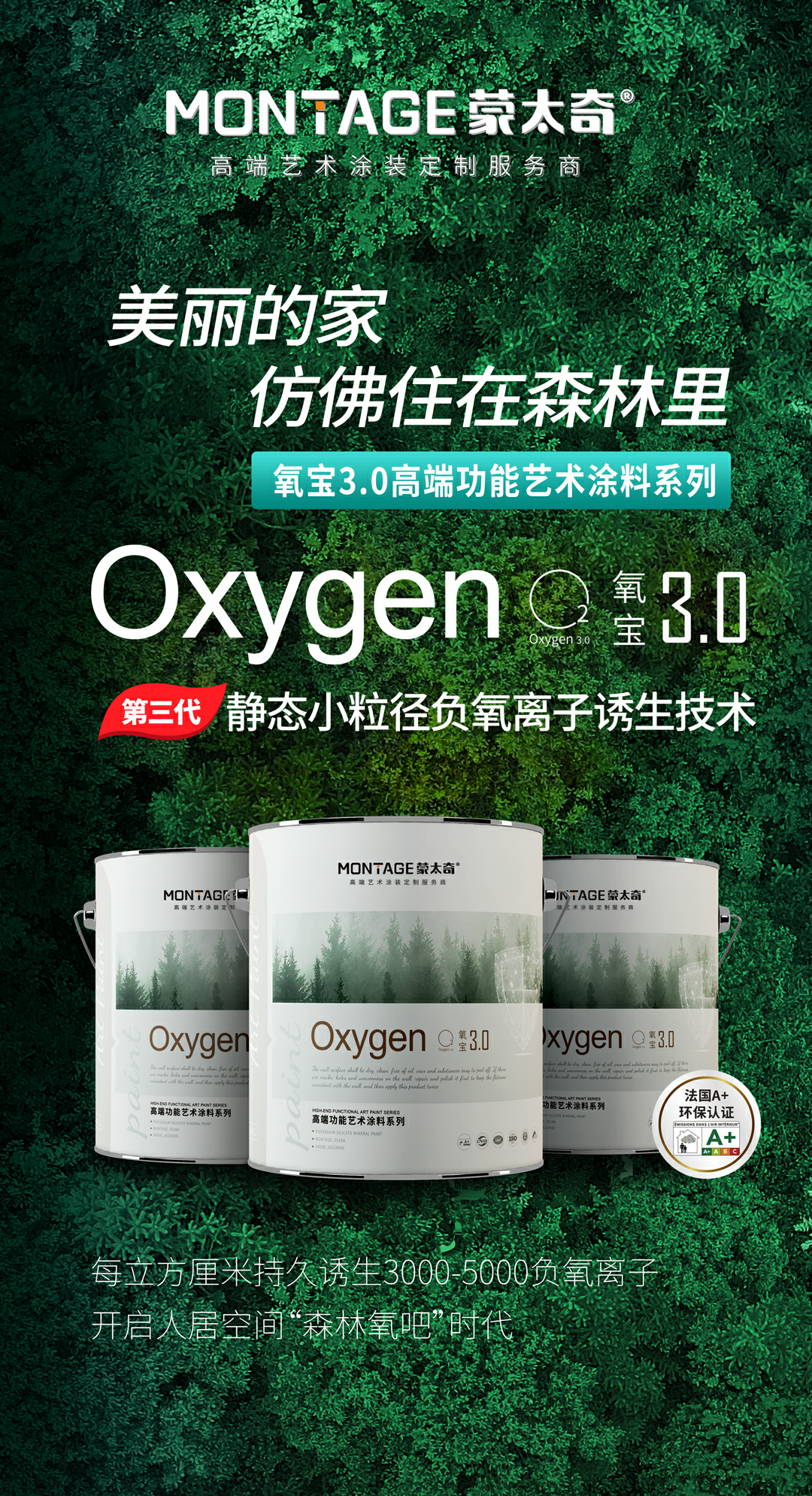 蒙太奇氧寶3.0系列搭載“第三代靜態負氧離子誘生技術”,能持久釋放負氧離子,其負氧離子含量與誘生量均通過國家檢測中心認證。具有優異的殺菌除味效果,沉降PM2.5、改善亞健康的功能,相當于將森林氧吧搬入家中。