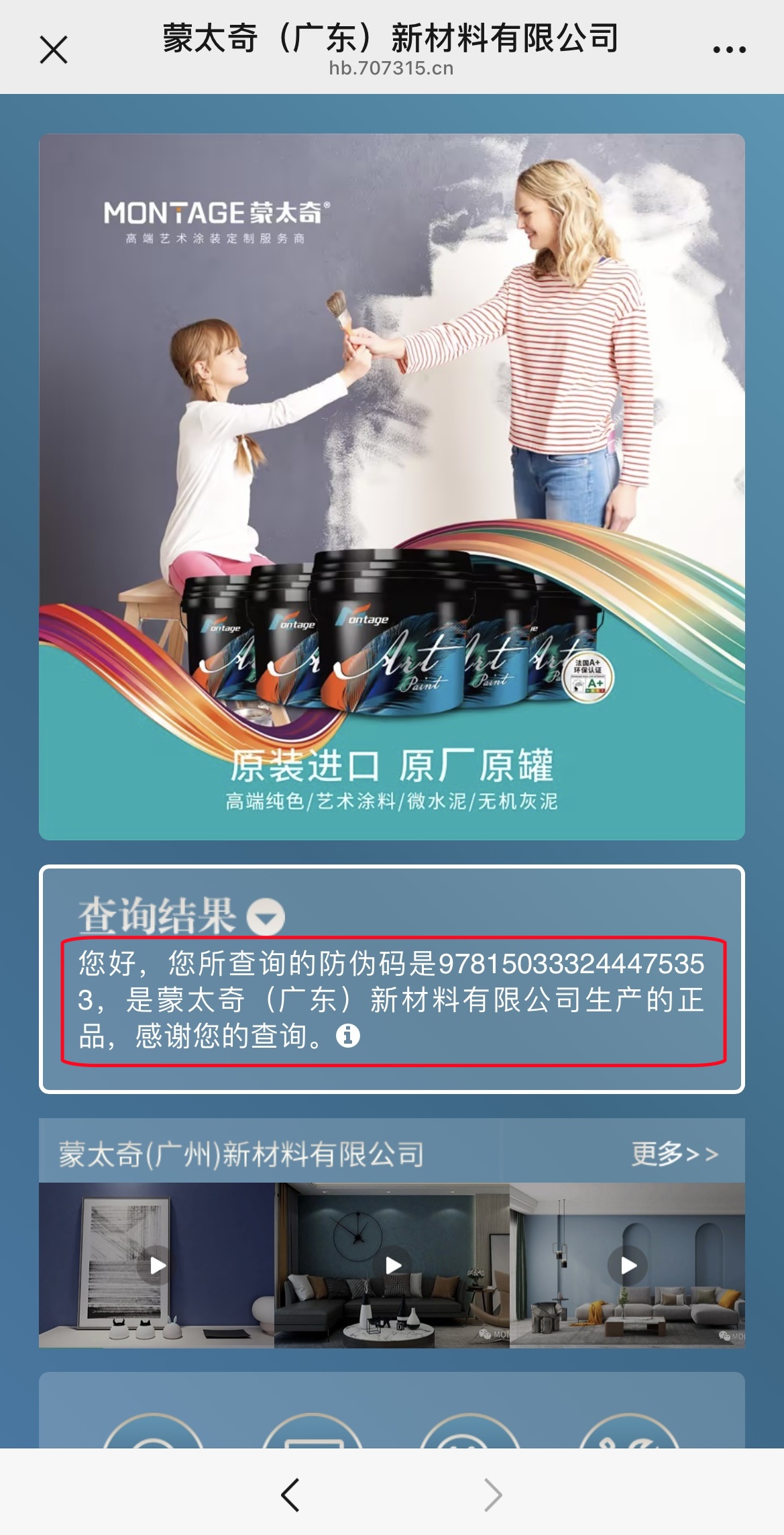 若結果顯示“是蒙太奇(廣東)新材料有限公司生產的正品”,請再核對查詢結果顯示的防偽碼與產品包裝上的防偽碼是否一致,若顯示以下信息,則該產品為官方正品。