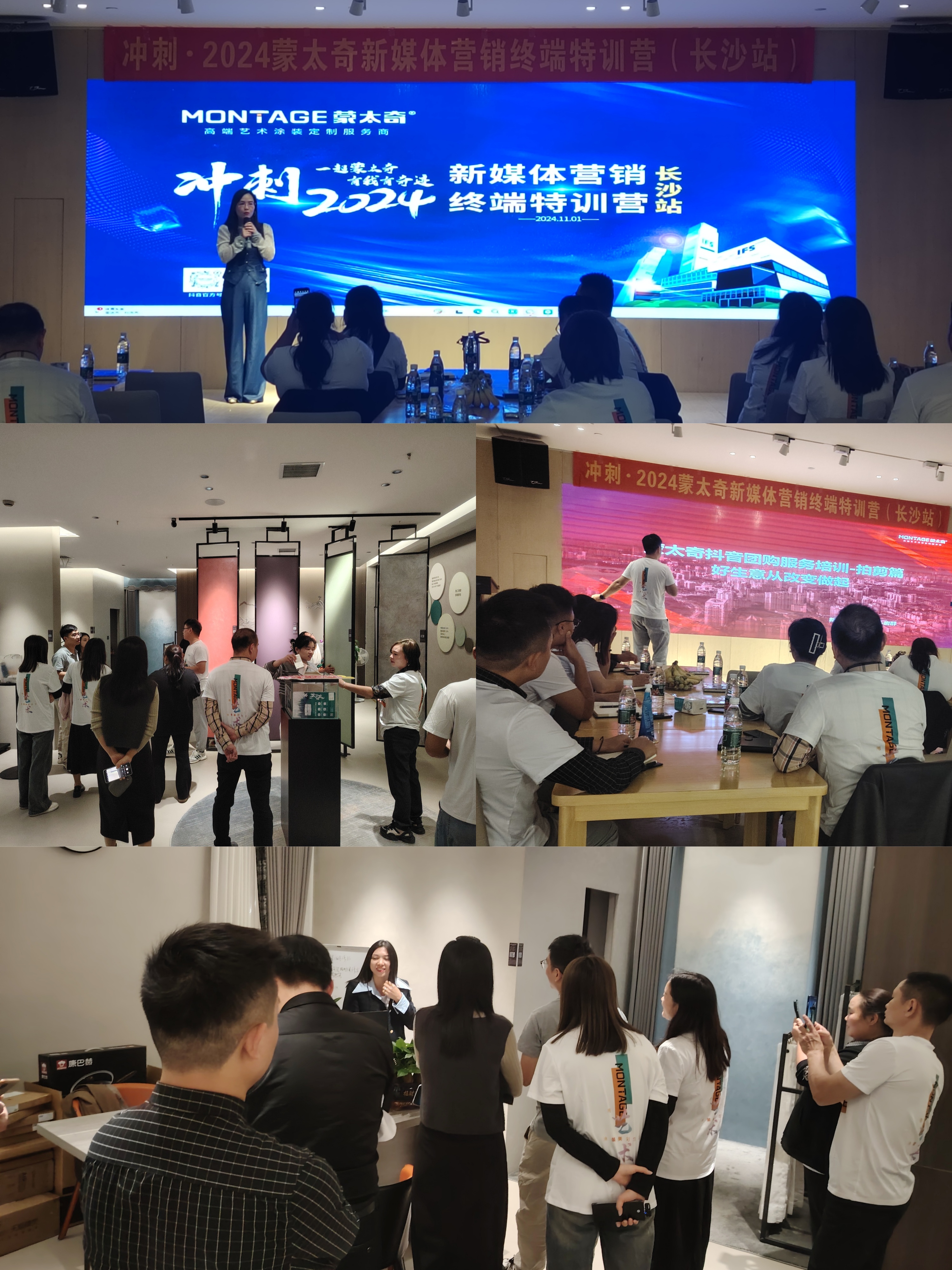 在蒙太奇雙11補貼季全國大促啟動同時,蒙太奇聚焦湘贛區域的經銷商,深度落地執行終端門店O2O營銷策略。蒙太奇品牌聯合創始人、藝術涂料最美老板娘呂芳方,親率團隊前往長沙,啟動長沙站“新媒體營銷終端特訓營”,為湘贛區域的經銷商開展終端門店新媒體運營實操培訓,并就雙11活動進行銷售動員與指導。
